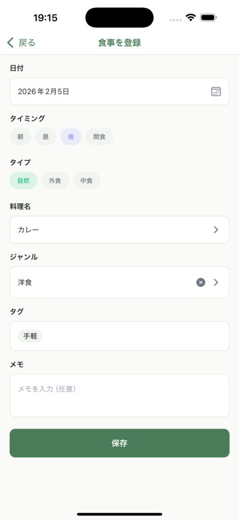 - かんたん食事登録 — 料理名を選ぶだけで記録完了。タイミング・タイプ・ジャンル・タグも選択式でサッと入力