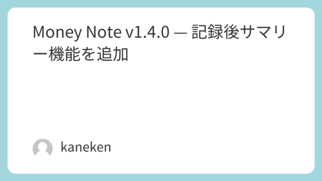 アップデート情報 Money Note v1.4.0 — 記録後サマリー機能を追加 Money Note v1.4.0 をリリースしました。取引保存後に今日と今月の合計を表示する「記録後サマリー」機能などを追加。 2026.03.02 アップデート情報